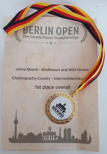 Für ihre Teilnahme am Wettkampf Choreographie-Country-Intermediate/advanced schrieb Jolina Mosch ihre eigene Choreographie. Sie trägt den schönen Titel: „Wildflowers and Wild Horses“ Jolina präsentierte ihren Tanz mit der bekannten Hingabe und wurde mit der Goldmedaille belohnt. Mit diesem Sieg konnte sich Jolina Mosch für die Weltmeisterschaft im Line Dance qualifizieren.