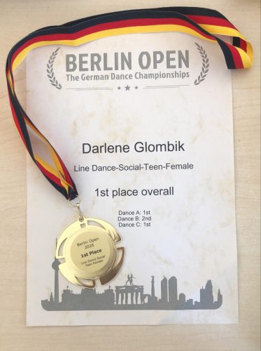 Darlene Glombik ist jüngstes Mitglied der Turniertänzer im Country und Western Dance des TSC Leipzig. Zumindest für den Tanzsportclub betrat sie den Tanzboden im Wettkampf zum ersten Mal. Sofort konnte sie sich in Line Dance-Social-Teen-Female den 1. Platz ertanzen. Trainerin Jolina Mosch lobt ihre sehr starke Leistung bei ihrem ersten Linedance Turnier mit strahlenden Augen.