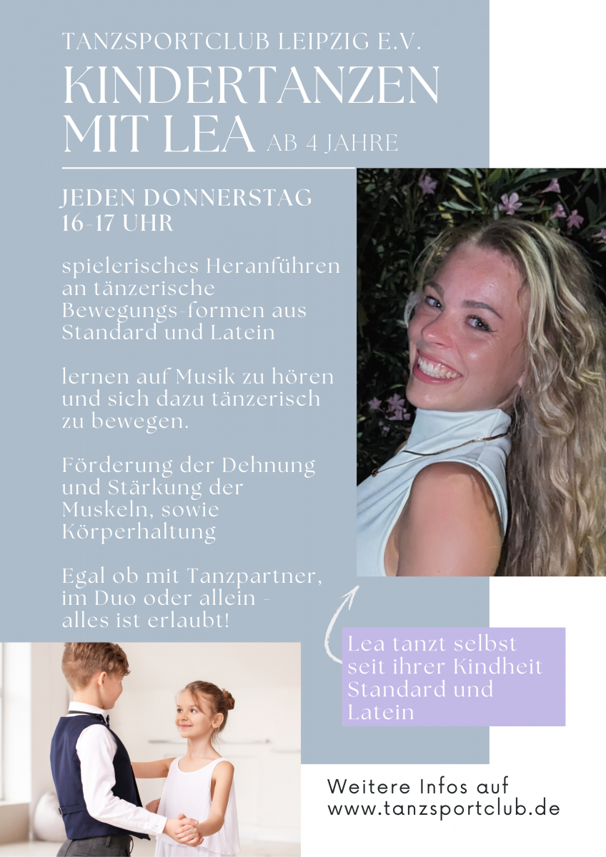 Unsere neue Trainerin Lea Hennig bringt frischen Wind in den Kinderbereich des Gesellschaftstanz. Selbst tanzt sie schon seit ihrer Kindheit Standard und Latein und vertritt den Tanzsportclub Leipzig erfolgreich mit ihrem Tanzpartner Loris im Turniertanz. Ihre Leidenschaft möchte sie nun auch an die Kleinen weitergeben.