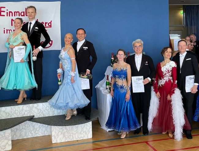 Thamms und Thielkes tanzten beim traditionellen Thüringer Tanz Turnier. Wie jedes Jahr am Wochenende nach Ostern richtete der Masserberger Tanzsportclub Rennsteigperle auch in diesem Jahr vom 25.04. bis 27.04.2025 das Masserberger Rotkäppchen Turnier aus. Ein festlicher Ball läutete am 25.04.2025 das Turnier für den Tanzsport auf höchstem Niveau ein. Immer wieder gerne tanzen die Paare zu Livemusik auf dem Parkett der Gymnastikhalle der Henneberg Reha-Klinik, bevor es in den Wettkampf geht. Heiß begehrt sind die Pokale in Form von Schieferplatten mit einem märchenhaften Motiv, die aus dem Thüringer Wald bekannt sind. Andreas und Anke Thielke erkämpften sich eine von den größeren mit einem souveränen 3. Platz im kombinierten Turnier B/A Masters II Latein. Nicht weniger stolz sind wir auf Rainer und Kristin Thamm, die sich gegen hochkarätige Konkurrenz auf den 5. Platz im Master III B Standard tanzten. Wir gratulieren beiden Paaren von Herzen.