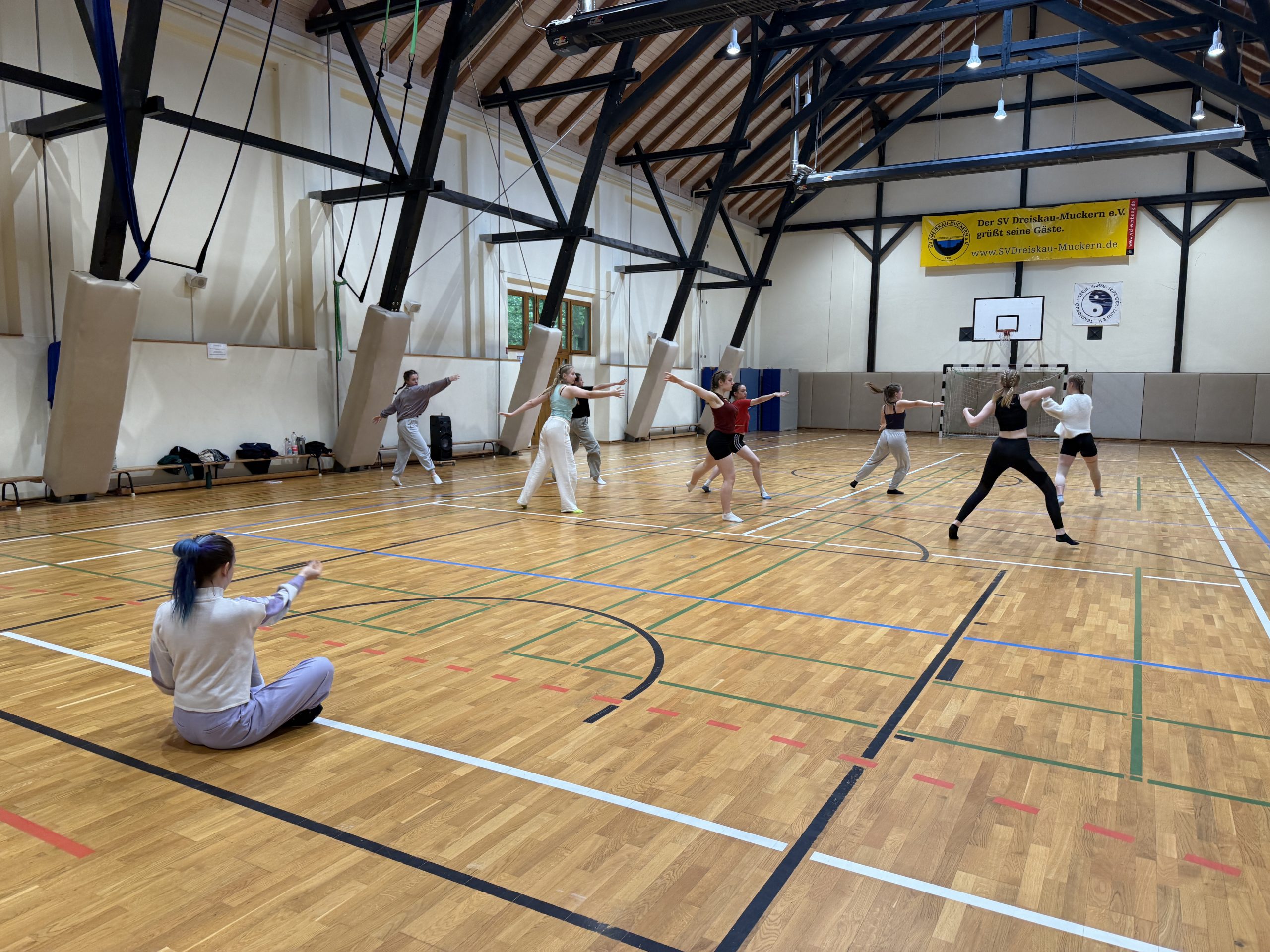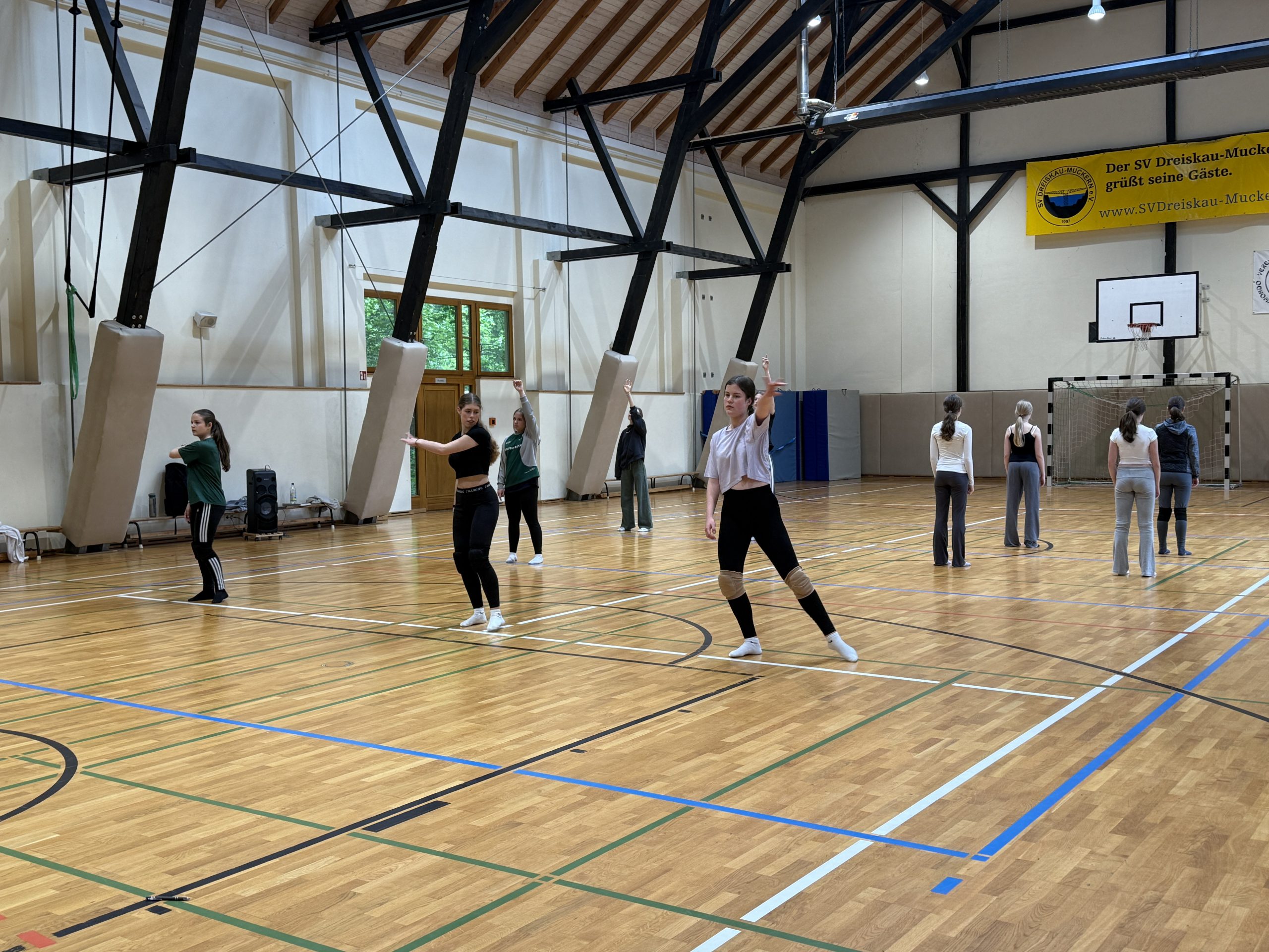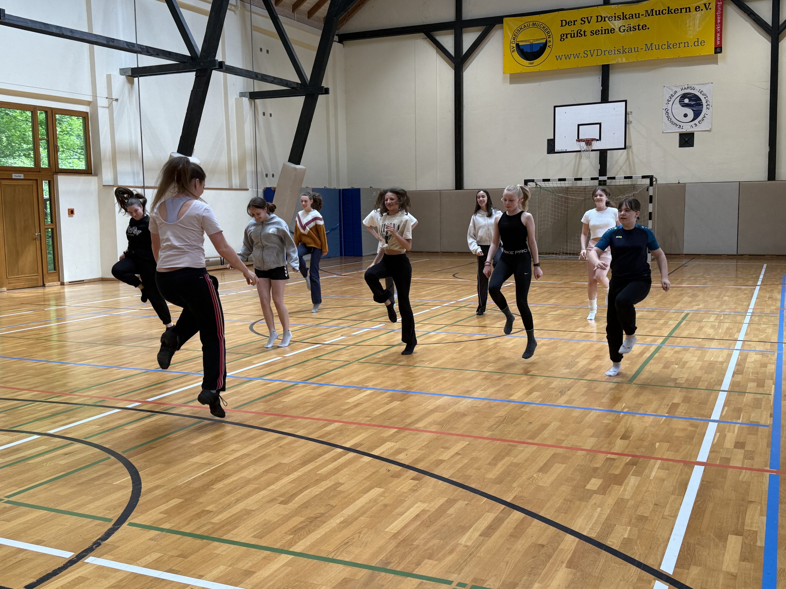 Am Freitag, den 04.05.2025 wurden die insgesamt 61 Kinder und Jugendlichen von ihren Eltern gebracht. Der Samstag war dann klug durchdacht und im 1,5 Stunden Takt verplant, dass Turnhalle, kleiner Saal, der Seminarraum sowie die Küche des Rittergutshofes von 7 Trainern benutzt werden und alle Teilnehmer auch ihre Pausen für Spiele für drinnen und draußen unter Aufsicht von 6 starken Betreuern bekommen konnten. Die jungen Teams, die gerade kein Training hatten, backten am Vormittag für die gesamte Mannschaft und probierten dabei viele neue Rezepte aus, wie zum Beispiel Zebrakuchen. Wenn am Nachmittag diese Tanzgruppen trainierten und ihre neuen Tänze für den Schautanztag einstudierten, widmeten sich die anderen Mädchen den Plakaten, die ganz wunderbar gelungen in den Schaukästen im Eingangsbereich des Vereinshauses ausgestellt wurden. Währenddessen wurde von den Obst- und Gemüsetellern genauso gerne genascht wie vom Kuchen. Am Sonntag, nach den letzten Trainingseinheiten, wurden erst die jüngeren Kinder wieder abgeholt. Die Tanzgruppen Daisys und Trance führten noch eine Generalprobe durch. Dann ging es auch für sie nach Hause.