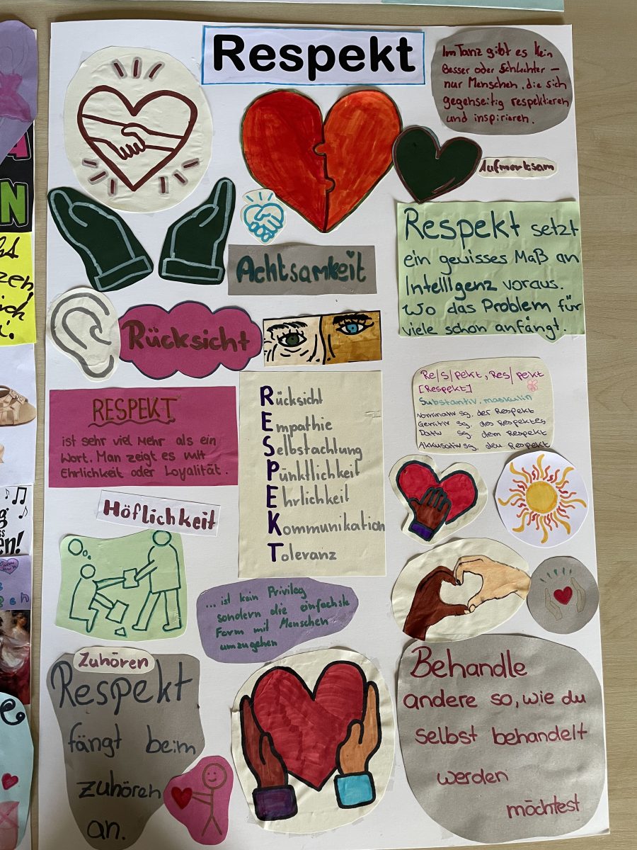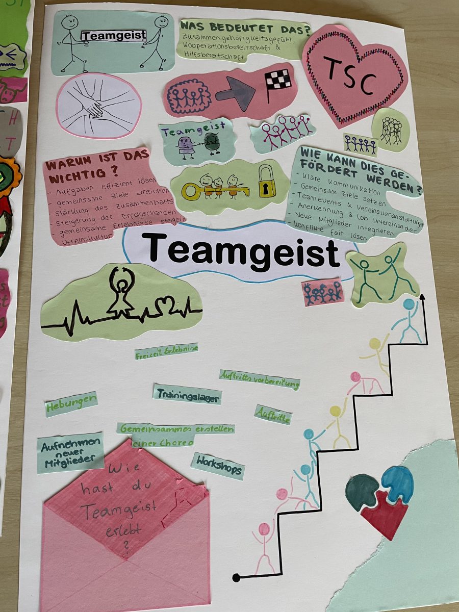 Unsere Jugendwartin, Christiane Böhme, hat sich das Thema Werte für das alljährliche Trainingslager auf die Fahne geschrieben. In diesem Jahr ging es von 2. Bis 4. Mai 2025 nach Dreiskau-Muckern, auf das ehemalige Rittergut. Dort wurden nicht nur die eigenen Träume und Vorstellungen unserer Vereins-Kinder in eigenen Choreografien vertanzt und einstudiert, sondern auch große Worte aus dem Verständnis unserer Kleinen auf Plakaten verständlich gemacht. Die vier wunderbar gelungenen Werke sind gleich im Eingangsbereich unserer Trainingsstätte ausgestellt. Mit jedem Eintritt ins Vereinsgebäude zu unseren Trainingsräumen werden die Blicke der Erwachsenen, wie Jugendlichen und Kinder, auf die Werte unseres Vereins für die ganze Familie gelenkt. Auf Augenhöhe können von jeder Generation in jede Generation über Vorstellungen, Wünsche oder Erwartungen gesprochen und diskutiert werden.